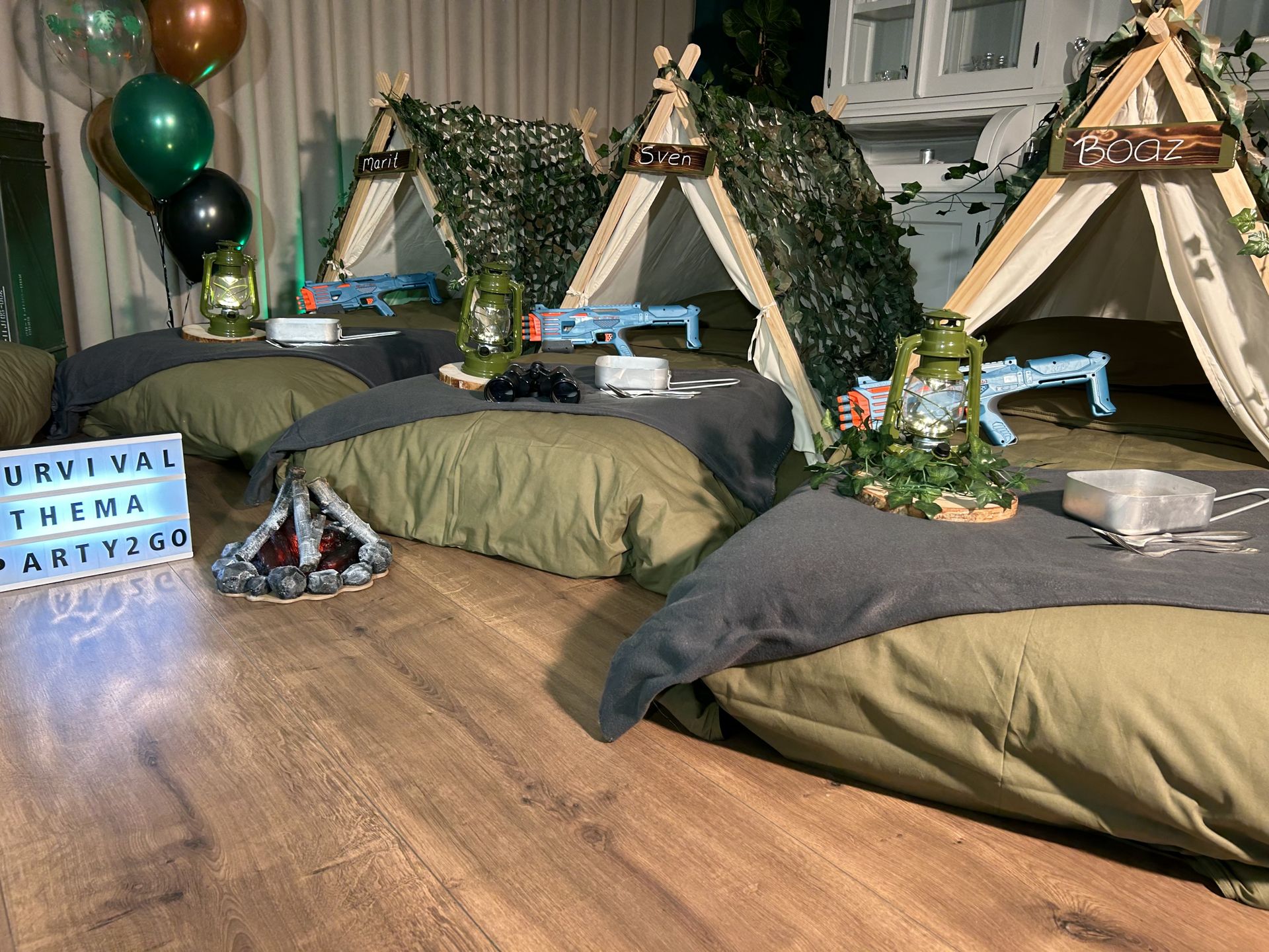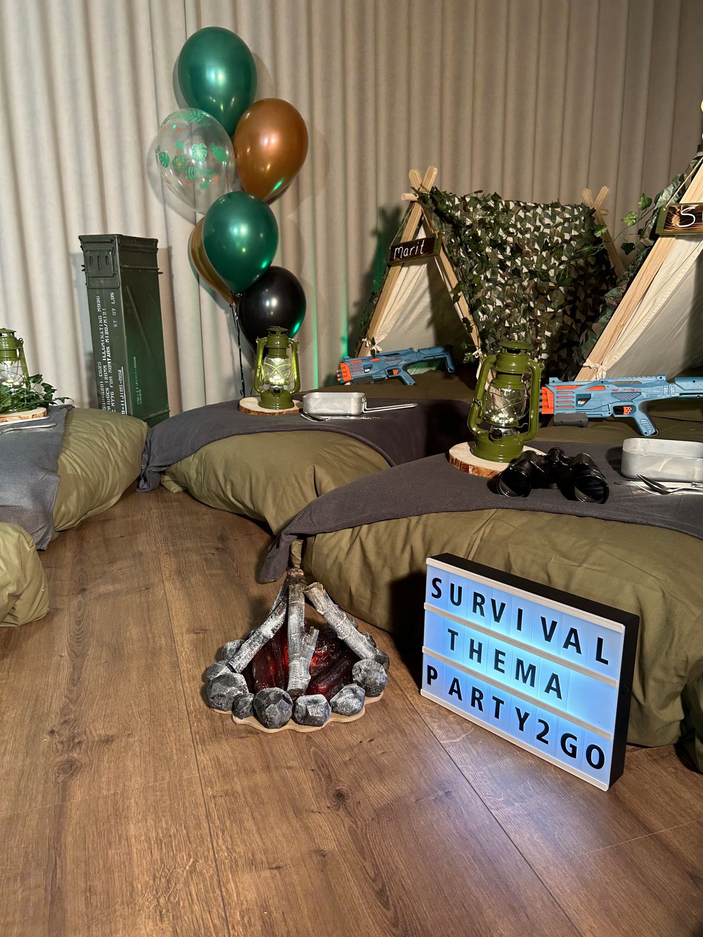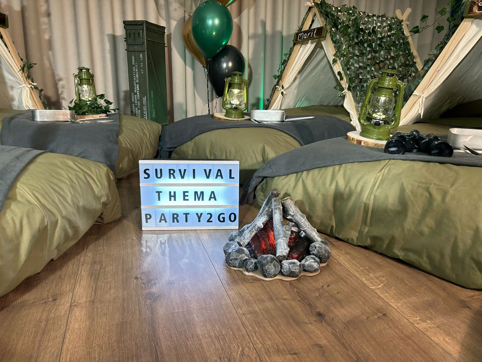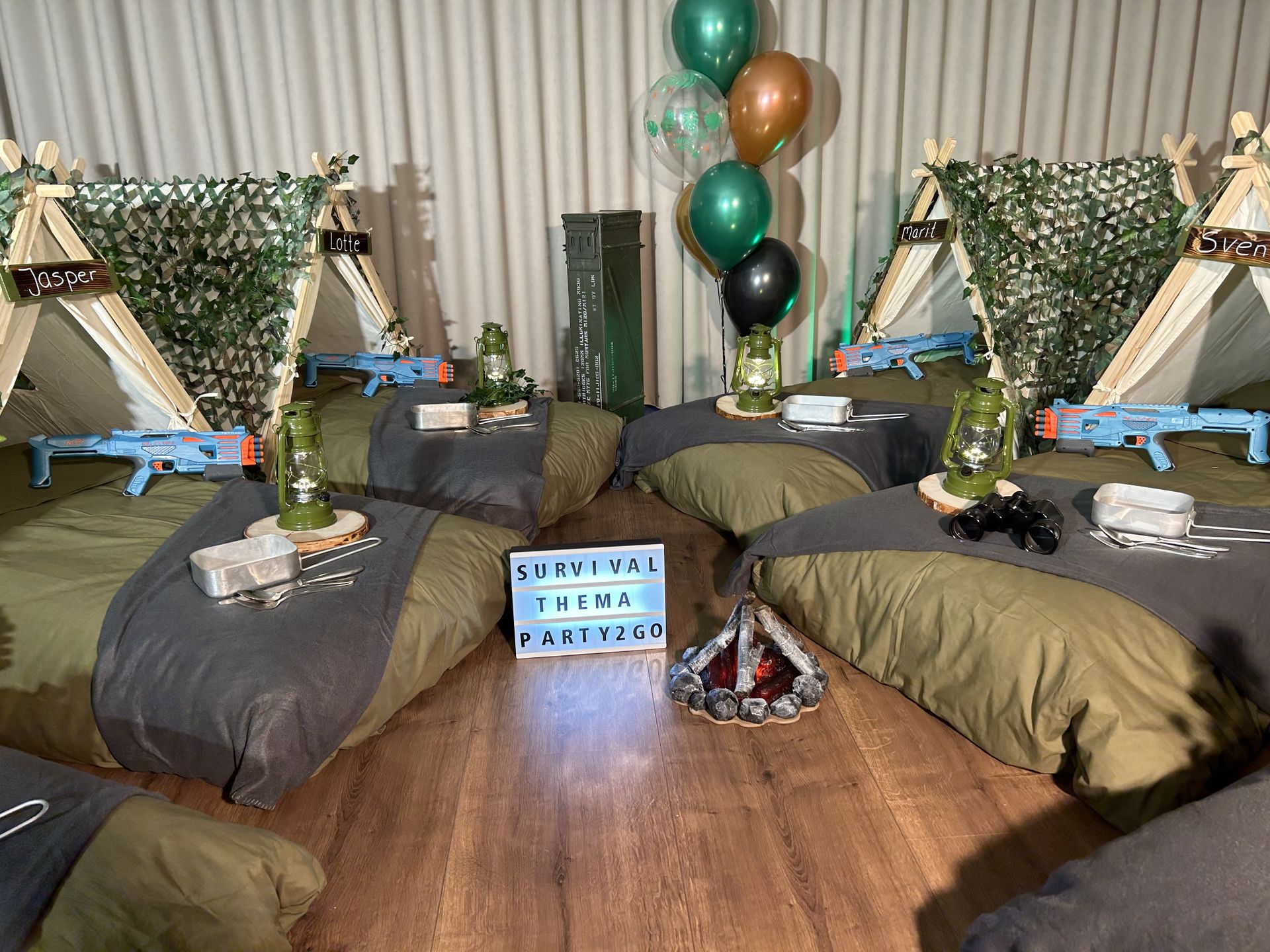 Dit stoere survival thema wordt geleverd met vele leuke decoraties zoals: