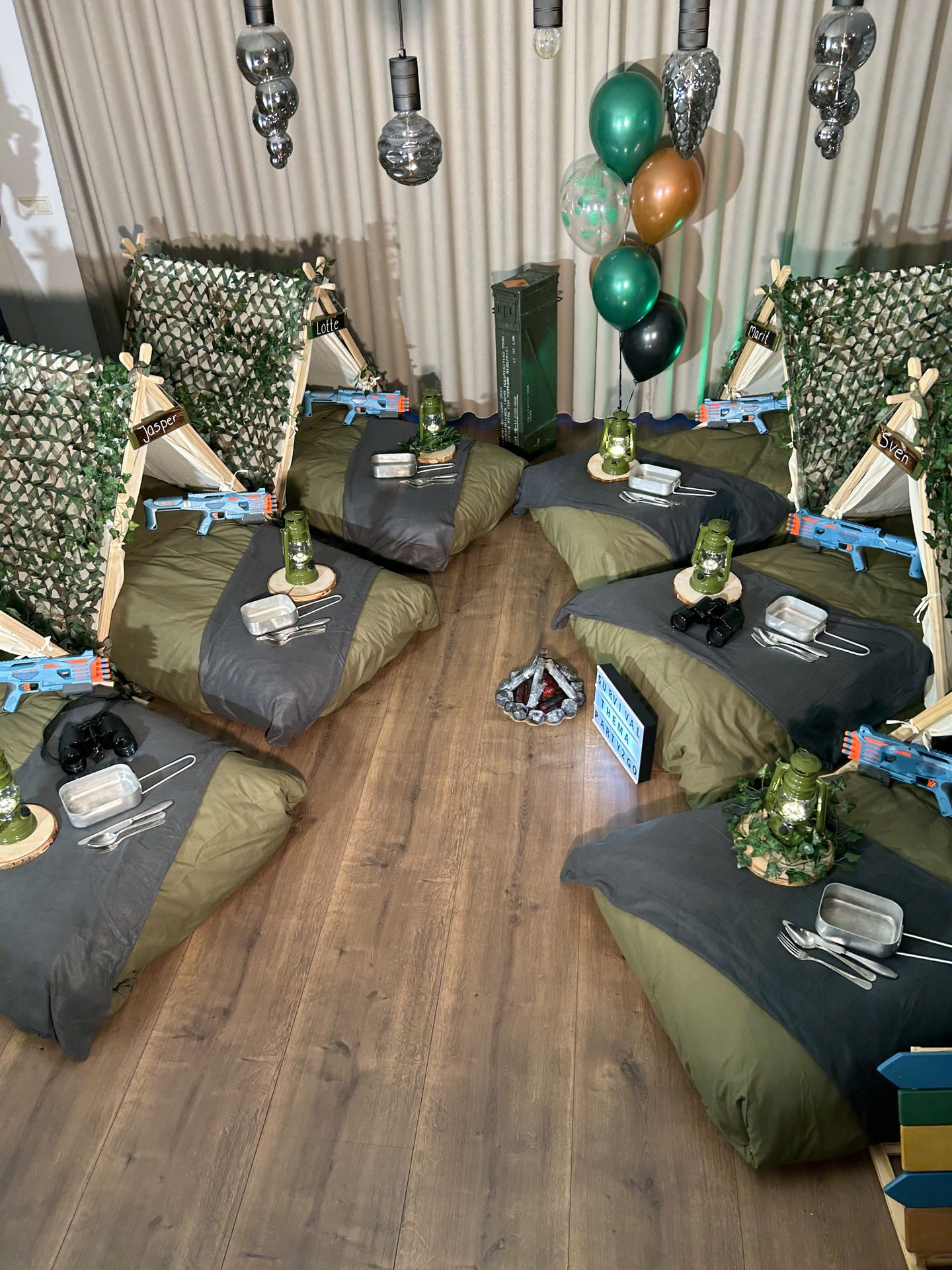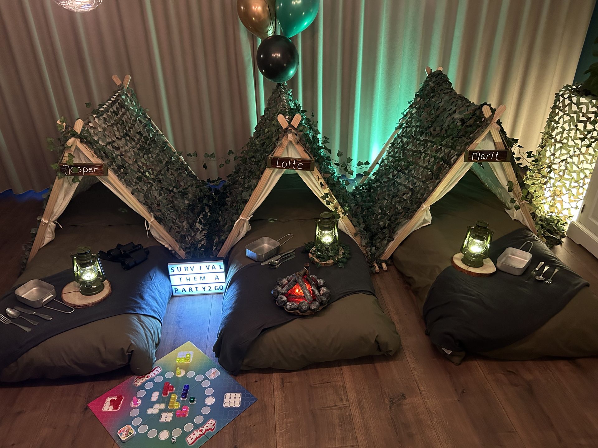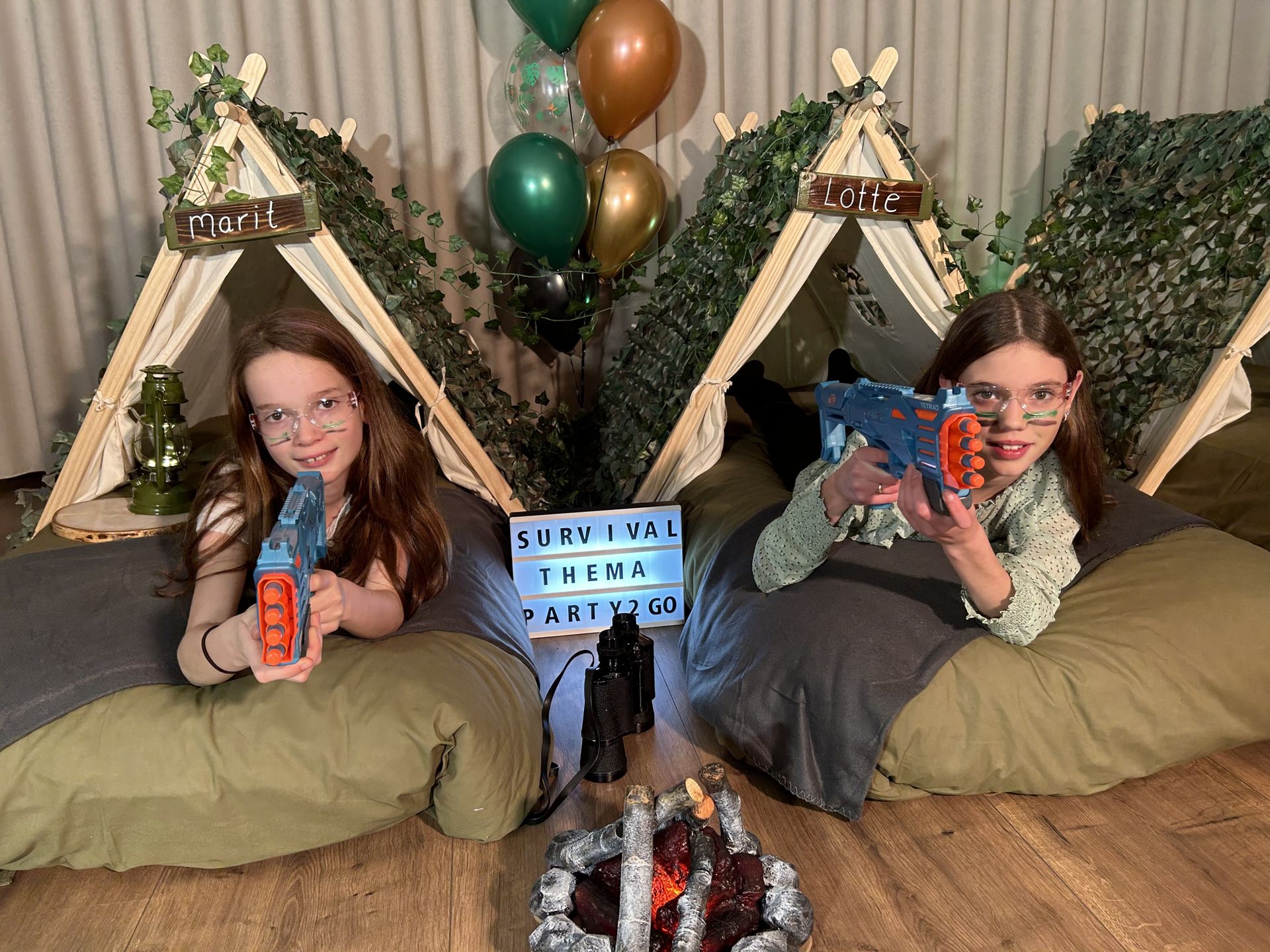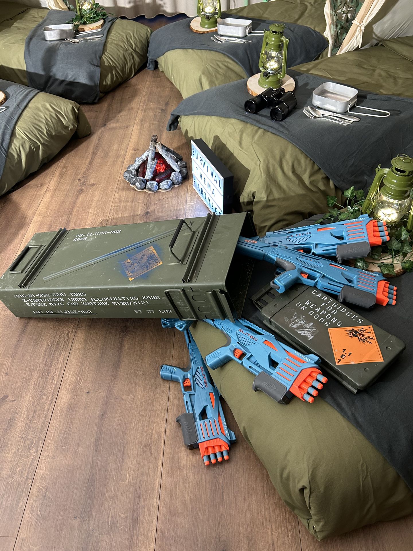 Dit stoere survival thema wordt geleverd met vele leuke decoraties zoals:
