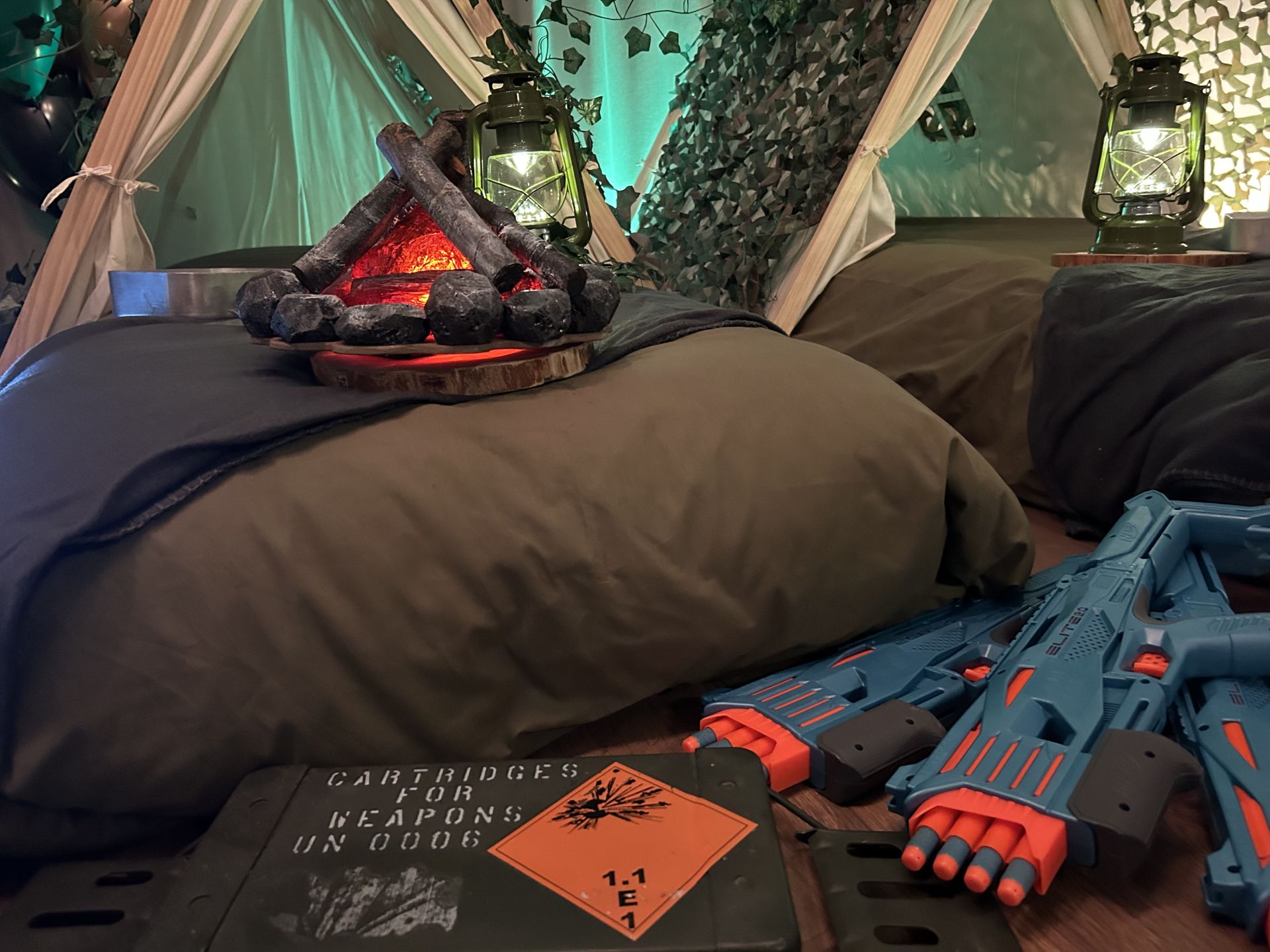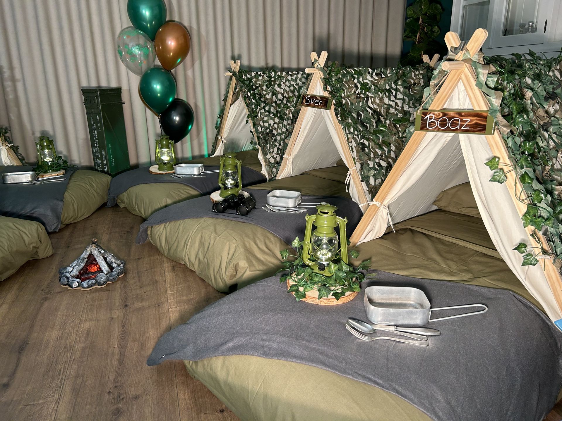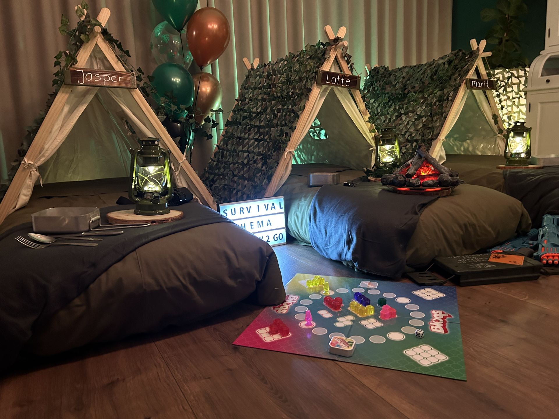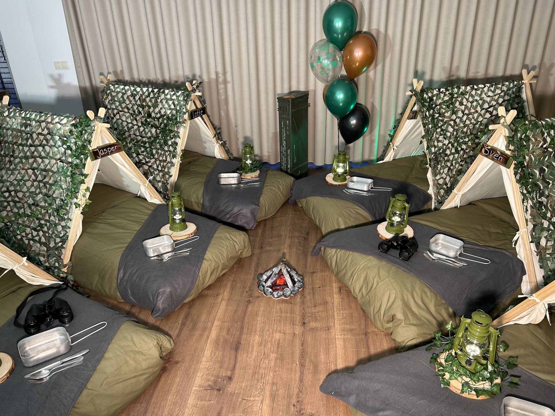 Dit stoere survival thema wordt geleverd met vele leuke decoraties zoals: