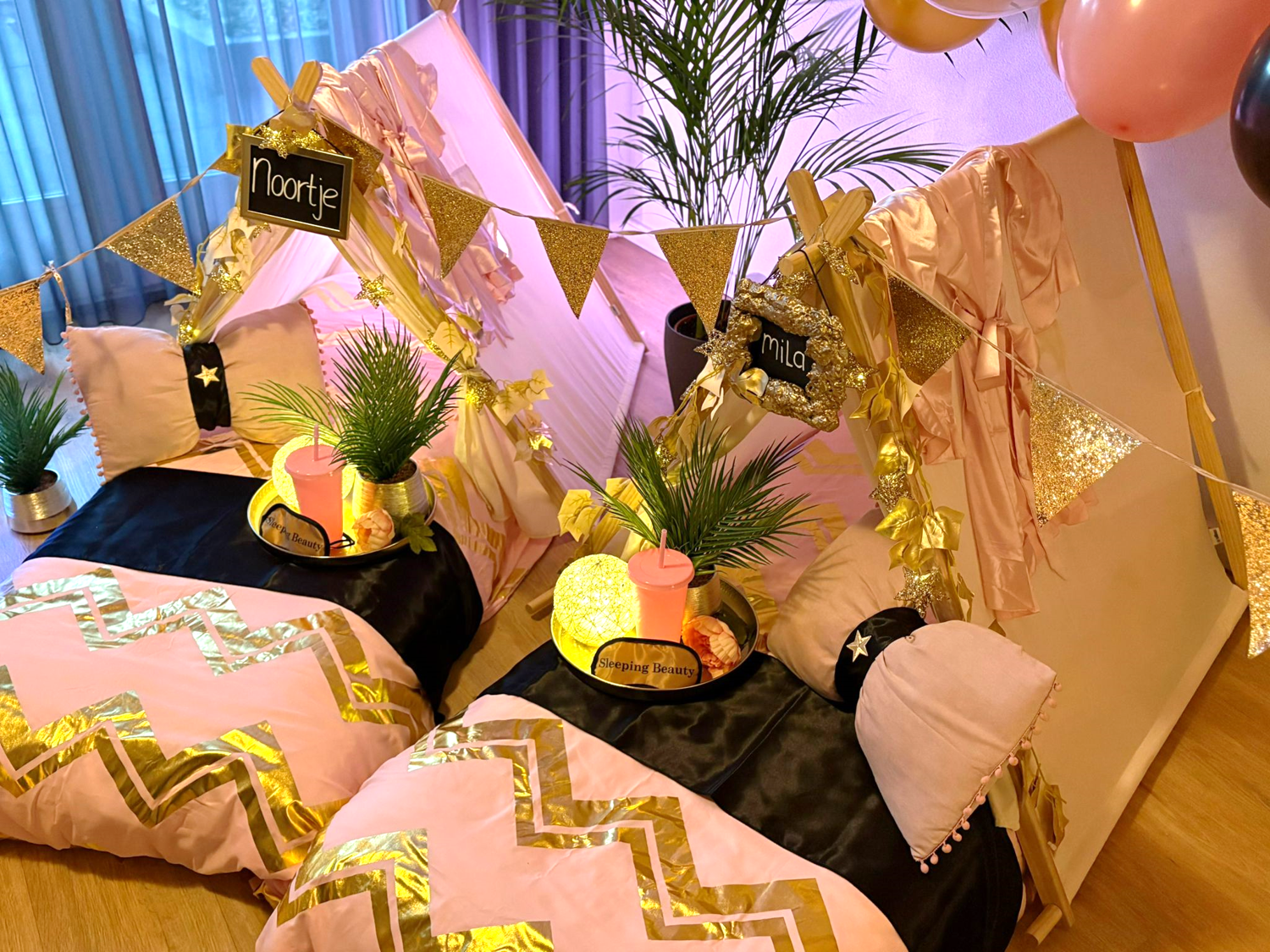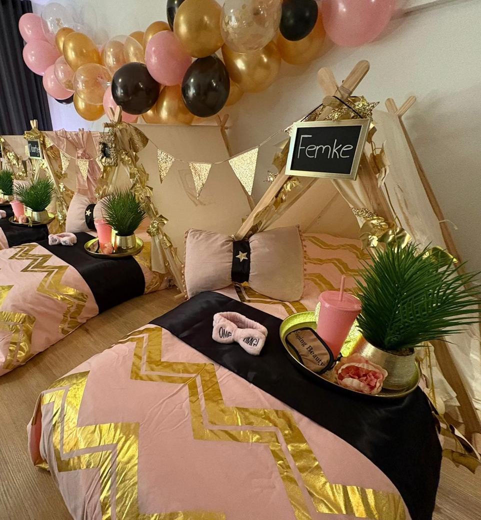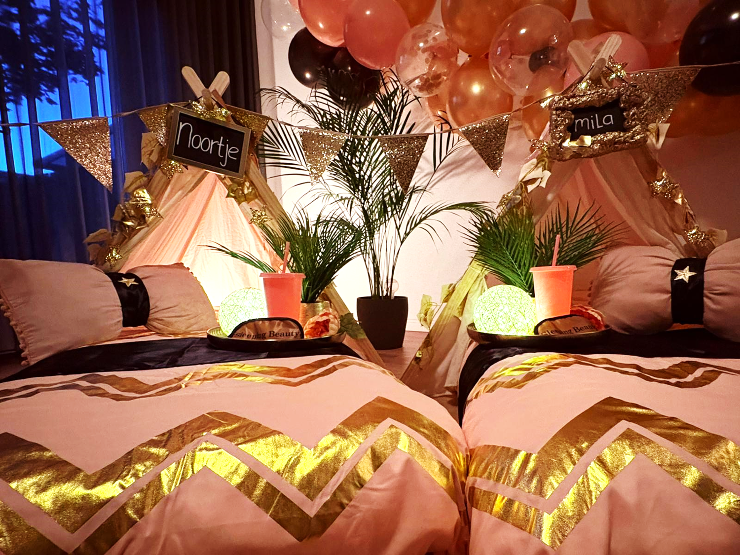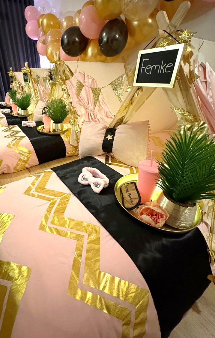 Dit thema is voor de echte glamour diva’s! Een luxe slaapfeestje vol goud en roze, zachte stoffen en stijlvolle details. Perfect voor een onvergetelijke avond met je vriend(inn)en!