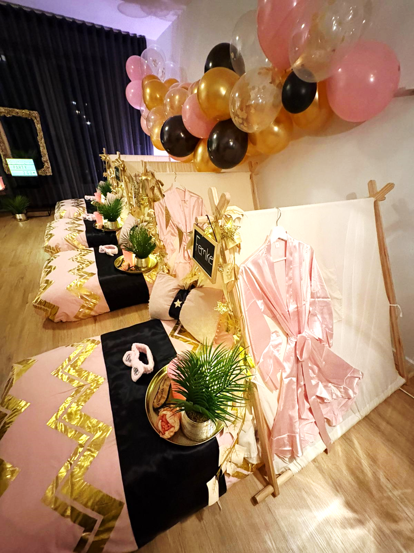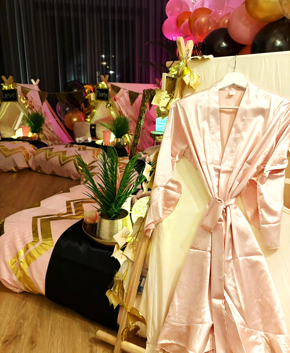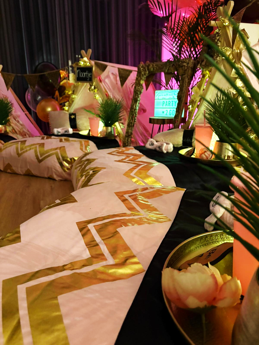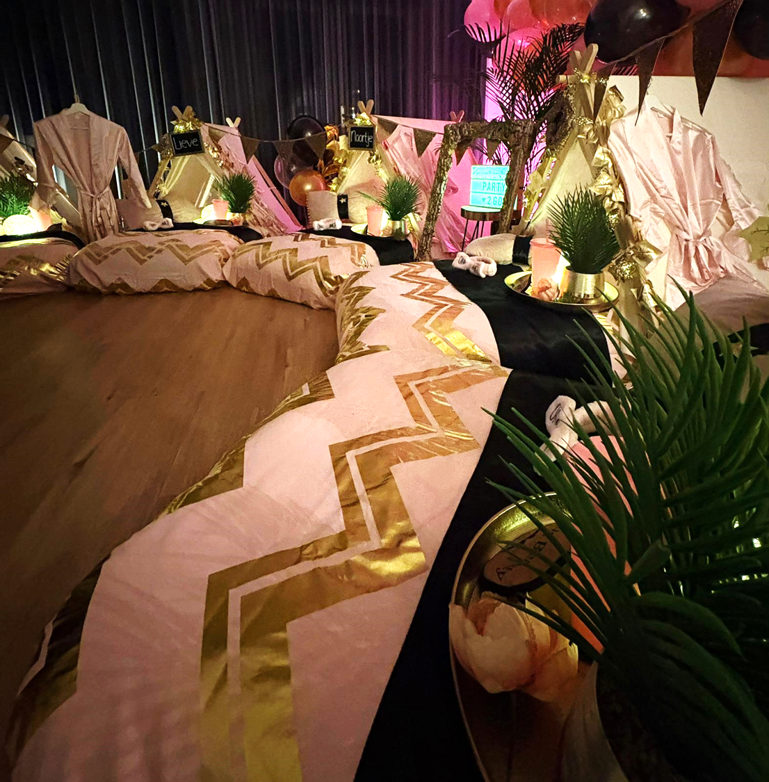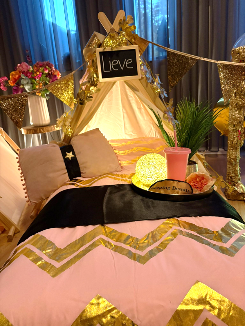 Dit thema is voor de echte glamour diva’s! Een luxe slaapfeestje vol goud en roze, zachte stoffen en stijlvolle details. Perfect voor een onvergetelijke avond met je vriend(inn)en!